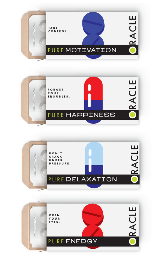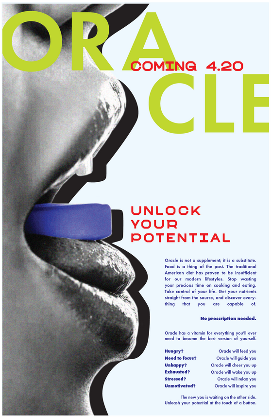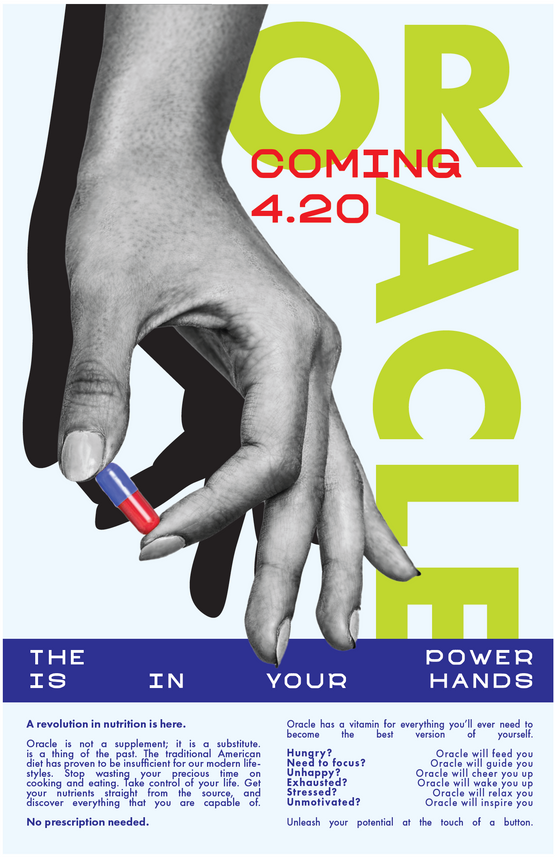 "Oracle" was a project that I came up with with the aim of creating poster advertisements for a company that is trying to replace food with medicine to increase efficiency in society. The aim was to create a dystopian sort of feel - very clean, modern and a little bit eery at the same time. Using phrases like "take control" was a way that I was able to communicate an omniscient feeling. I pulled inspiration from works like 1984, Divergent, The Giver, etc.