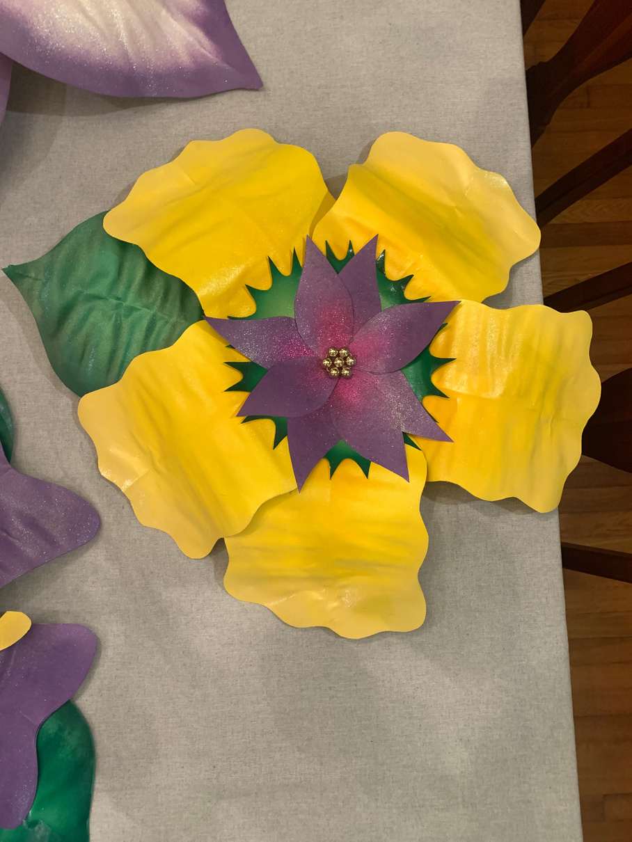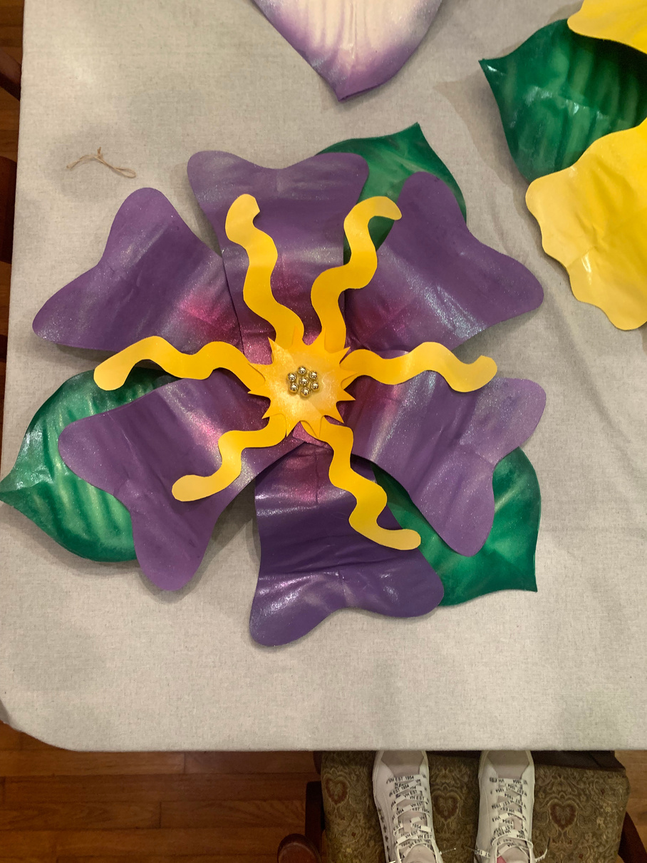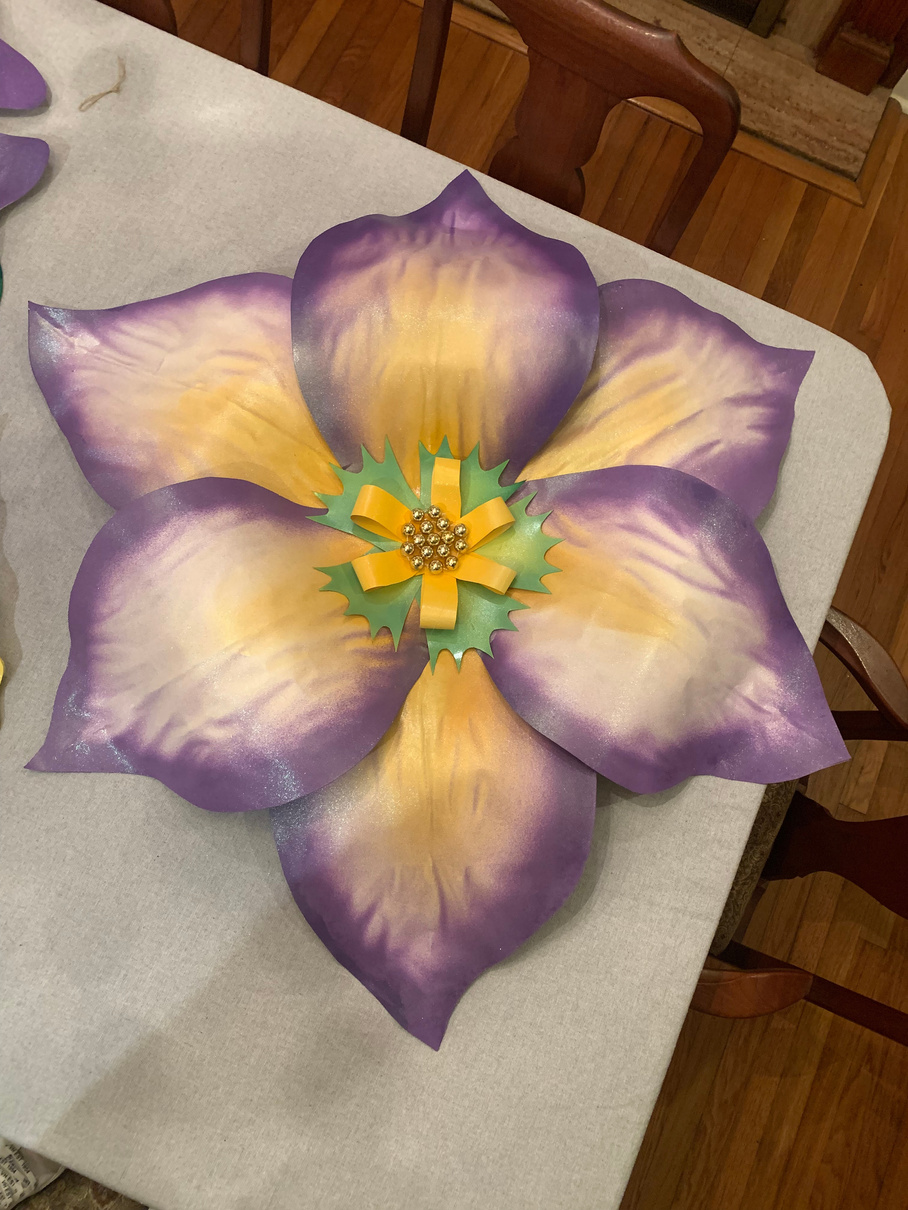 As the popularity for decorating your house with Mardi Gras float flowers grew, I made some for myself. Used spray paint, poster board and wire to build these 4-foot flowers.
