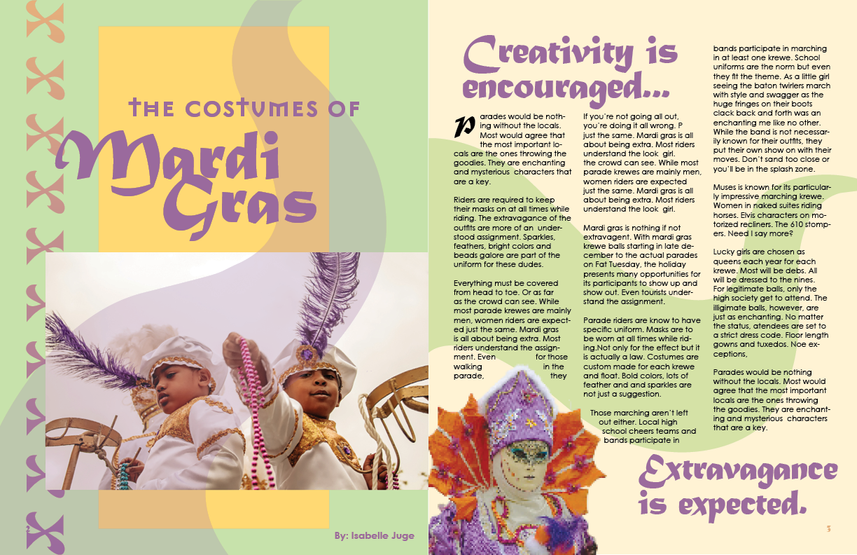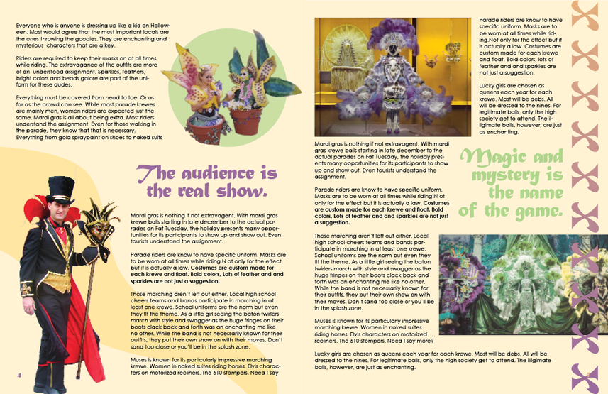 I was tasked with creating a two page magazine spread with the theme of our choice. I took inspiration from the city I grew up in, honoring the artistry that is poured into the Holiday's costumes every year.