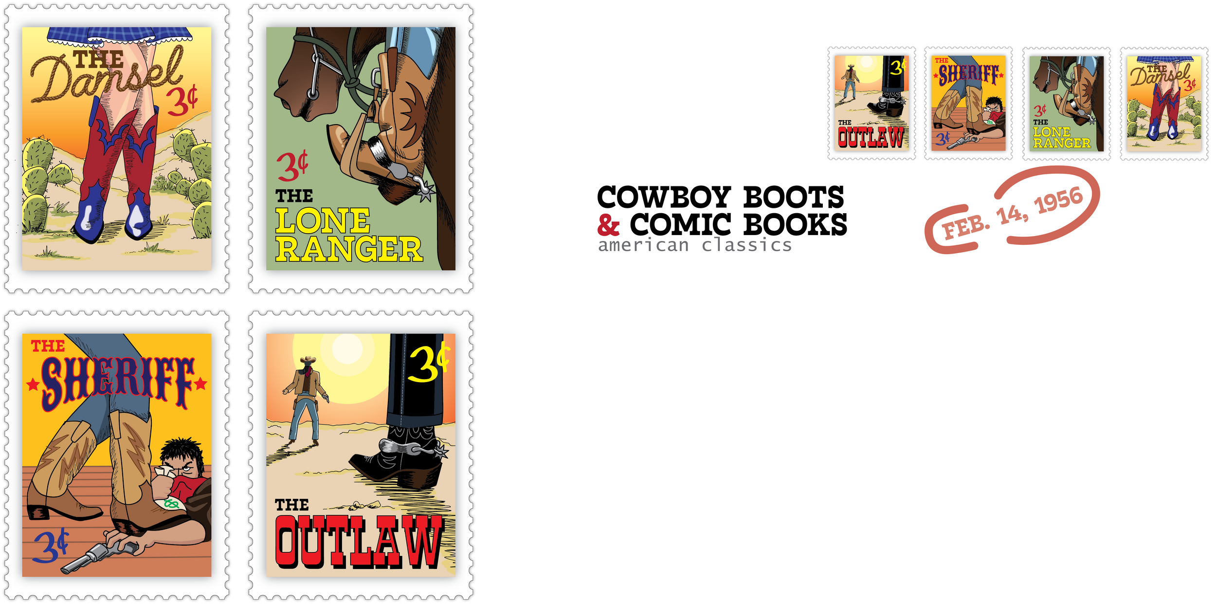 Tasked with creating our own line of collector stamps from a chosen object, I chose cowboy boots. I paid homage to vintage wild west comic books where the covers told a story but still focused on the boot as the character in the comic covers .
